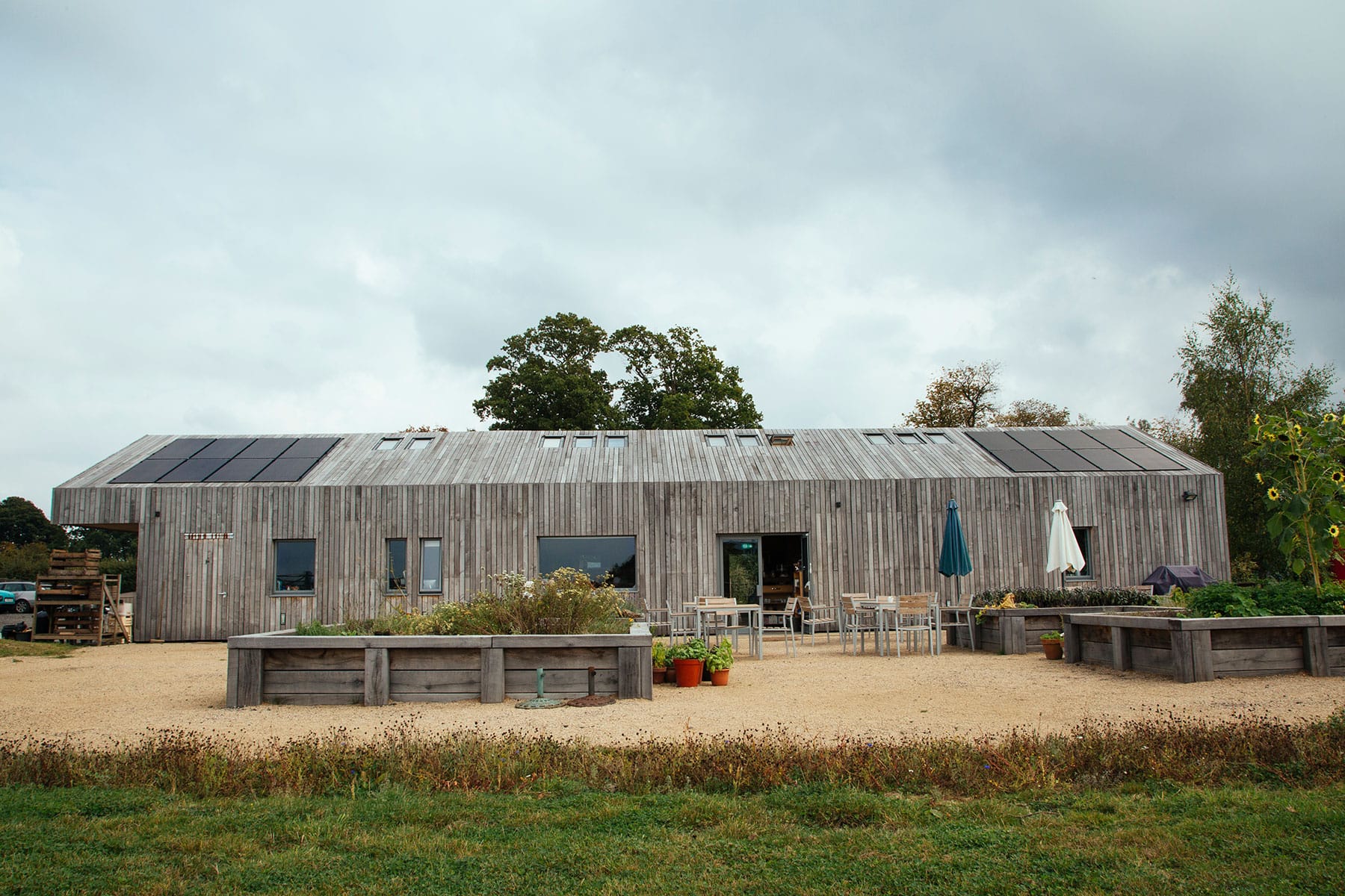 We demolished the original farm building and constructed and built a new modern but traditional-looking barn. It is fully sustainable with solar panels and a rain water collection site. The farm shop was clad in untreated sweet chestnut, sourced locally and left to weather to give it a natural, beautiful finish which is completely in keeping with its surrounding.